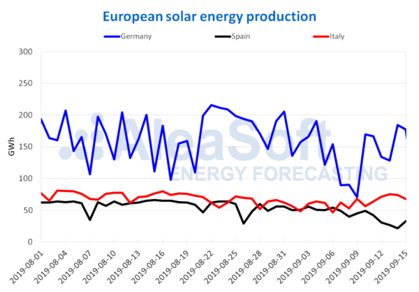 The solar energy production, which includes photovoltaics and solar thermal, decreased by about ‑29% in Spain. While in Germany and Italy rose 6.4% and 20% respectively. For this week of September 16, in AleaSoft a moderate fall in the solar energy production of Italy and a production a little higher than last week in Spain are expected. In the case of Germany, it is expected to remain with little variation.