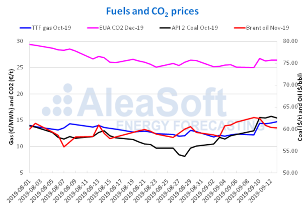 The CO2 emission rights futures in the EEX market for the December 2019 reference contract, ended last week with a price 5.2% higher than the one obtained the previous Friday. After the rise on Tuesday, September 10, of 6.8% compared to Monday, prices stabilized during the rest of the week. At the close of the session on Friday, September 13, the price was €26.40/t, €1.31/t higher than Friday, September 6.