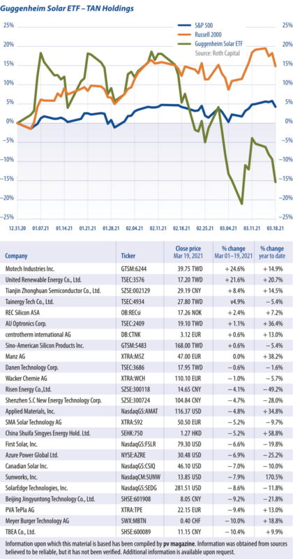 In the month of March, the solar industry underperformed in the market. The Invesco Solar ETF (TAN) decreased by 16.3%, while the S&P 500 and DJIA increased by 0.3% and 3.5%. The five stocks in the U.S. market that saw the largest losses were Daqo (-32.5%), Sunnova (-25.9%), Array (-25.2%), JinkoSolar (-18.3%), and ReneSola (-18.0%). The reasons given for the sell-down include the rising interest rate with the 10-year treasury up 20% from 14.5% at the beginning of March, as well as sector rotation and concerns about the proposal from California Investor Owned Utilities (IOU) to increase grid-access fees.