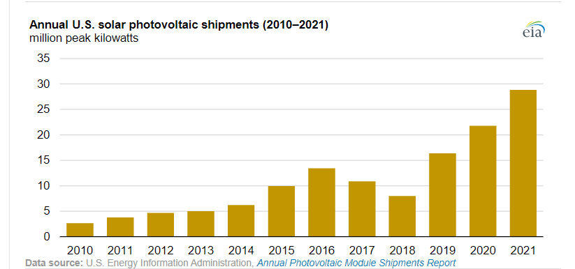 In 2021, the United States recorded nearly 29 million module shipments. This number was only 320,000 when EIA began reporting it in 2006, and about 3.7 million in 2011.