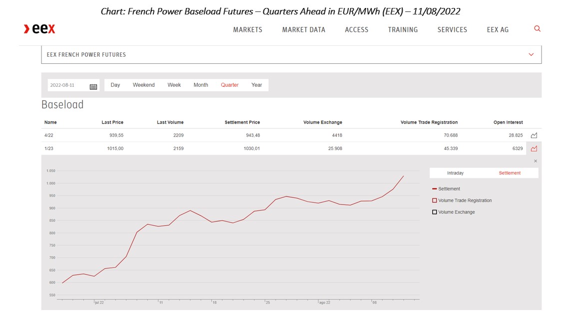 On August 11, the Q1 2023 Baseload contract in France even managed to reach the 4 digits threshold on EEX; trading above €1,000/MWh (followed shortly after by the calendar 2023 Baseload contract, which traded above €1,000/MWh as well on August 26).