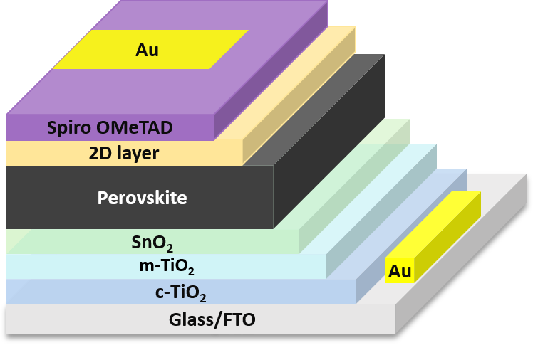 For their 3D/2D solar cell, the team used three organic ammonium salts: 2-methoxy-PEAI (o-OMe-PEAI), 3-methoxy-PEAI (m-OMe-PEAI), and 4-methoxy-PEAI (p-OMe-PEAI). They built the device with a fluorine-doped tin oxide (FTO) substrate, a commercially pure titanium oxide (cp-TiO2) electron transport layer, a mesoporous titanium dioxide (mp-TiO2) layer, a tin(IV) oxide (SnO2) buffer layer, the perovskite layer, the OMe-PEAI layer, a spiro-OMeTAD hole transport layer, and a gold (Au) metal contact.