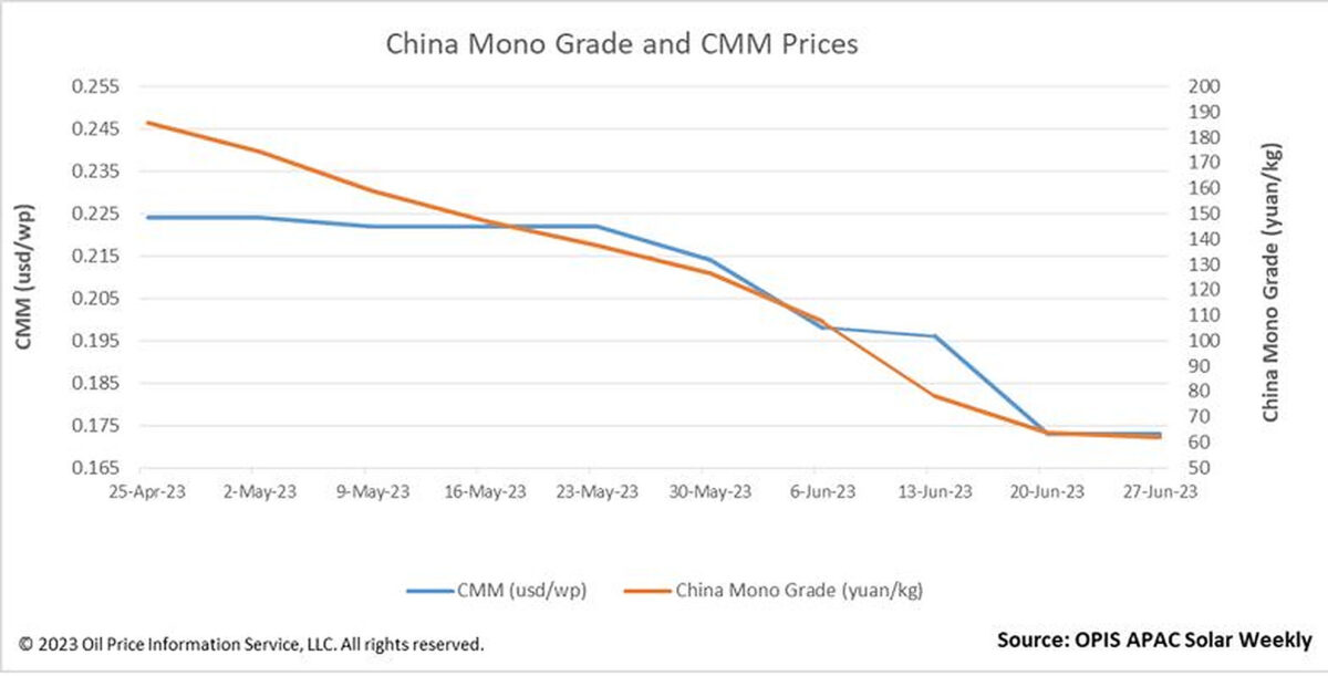 There has been a glimmer of calm in the downstream business as a result of the pricing of China Mono Grade becoming less volatile this week. Wafers prices have also stabilized for the first time after falling for more than two months. The Chinese Module Marker, the OPIS benchmark assessment for modules from China, held steady at $0.173 per W this week after four weeks of plunging prices. Looking ahead, OPIS believes that the production costs of the supply chain are no longer the decisive factor in pricing, and the ensuing changes in demand will have a significant impact on the prices of each manufacturing segment.