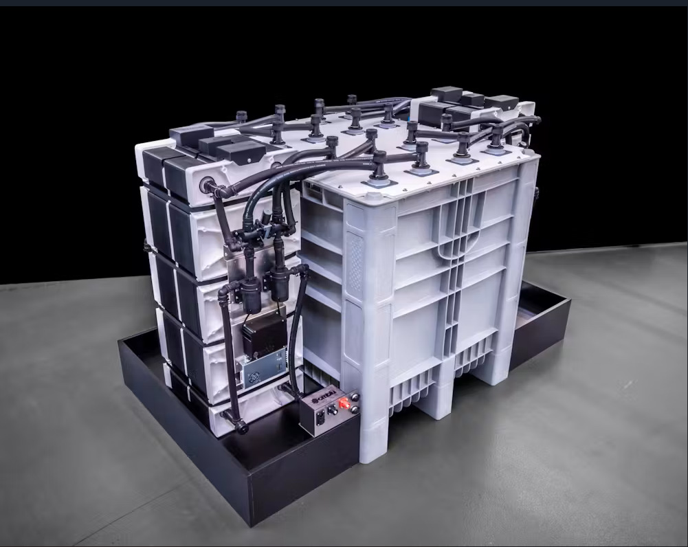 CMBlu fills two separate storage tanks with a solid polymer and then transfers it to and from the liquid electrolyte, which is pumped into an electrode stack for charging and discharging cycles.