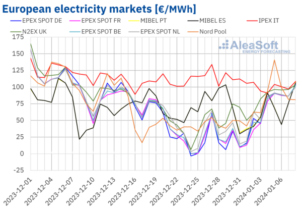 As for hourly prices, the German, Belgian, French and Dutch markets registered negative hourly prices on Jan. 1 and 3. On Jan. 1, the British market also registered negative prices. However, these negative prices were not as low as those reached in these markets during the previous week. On the other hand, on Friday, Jan. 5, from 16:00 to 17:00, the Nordic market price was €254.58/MWh. This was the highest hourly price since December 2022. The MIBEL market registered the lowest daily prices between January 5 and 7, which helped it to have the lowest weekly average compared to the rest of the main European markets.