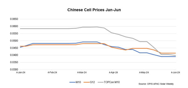In the Chinese domestic market, Mono PERC M10 cells were priced at about CNY 0.313/W while TOPCon M10 cells stood at about CNY0.320/W, according to OPIS market survey.