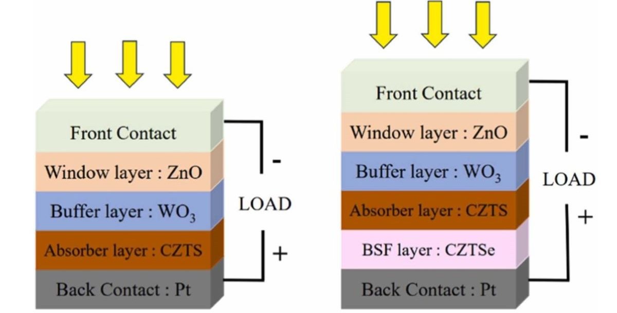 In the study, one device was structured without the BSF layer, with zinc oxide (ZnO) as the window layer, WO3 as the buffer layer, CZTS as the absorber layer, and Pt metal substrate, noted by the researchers as Pt/CZTS/WO3/ZnO structure. The other device was similarly structured but with an additional CZTSe BSF layer sandwiched between the CZTS and Pt layers, which was noted as Pt/CZTSe/CZTS/WO3/ZnO structure.
