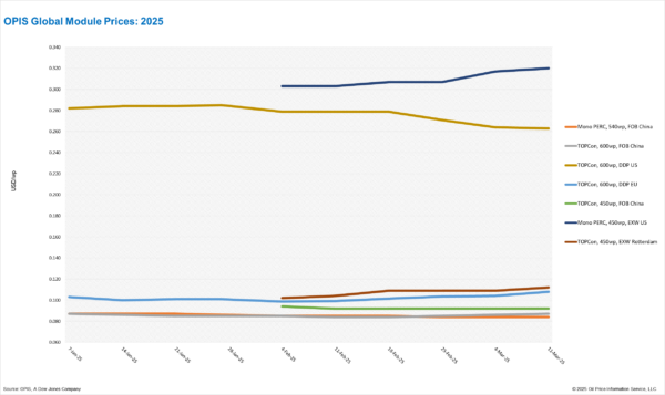 China: The Chinese Module Marker (CMM), the OPIS benchmark assessment for TOPCon 600 W modules from China, rose 1.16% to $0.087/W Free-On-Board (FOB) China, with higher price indications between $0.082 and $0.090/W. FOB China Mono PERC module prices remained stable at $0.085/W with indications between $0.081 and $0.088/W.