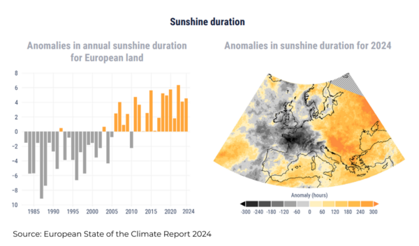 The European State of the Climate 2024 report, jointly produced by Copernicus Climate Change (C3S) and World Meteorological Organization (WMO) using ECMWF (European Centre for Medium-Range Weather Forecasts) data, has confirmed a year of extremes, with 2024 officially declared the warmest year on record for the continent. Among its findings is a detailed assessment of solar conditions across Europe, including sunshine duration anomalies that highlight a long-term positive irradiance trend as the climate changes, and a 2024 marked by an east/west divide in solar radiation.