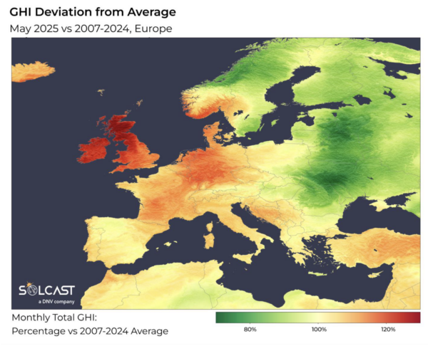 A stubborn pressure system across Western Europe has led to record-breaking solar conditions in the United Kingdom and Germany during May, while the east of the continent endured a starkly different experience under low pressure. According to analysis using the Solcast API, irradiance anomalies drove record solar generation in the United Kingdom and contributed to frequent negative power prices in Germany, as well as freezing conditions and widespread cloud suppressing irradiance in eastern Europe.