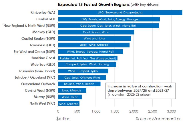 Sydney-based Macromonitor is forecasting the rollout of renewables will push construction activity in Australia’s regional areas up AUD 23 billion ($14.94 billion), or 19%, between 2024/25 and 2026/27, well ahead of the $12 billion, or 7%, increase forecast for capital cities.