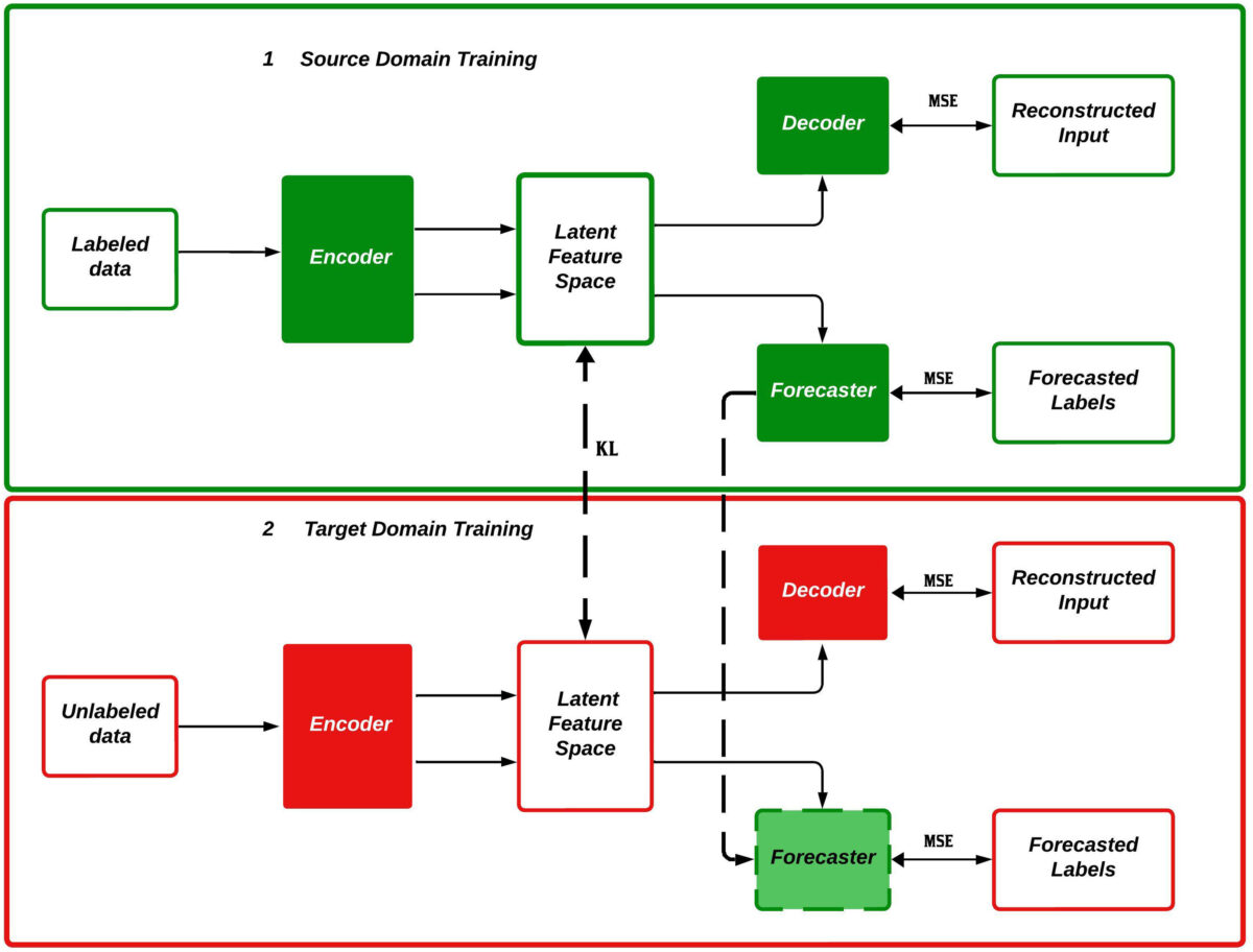 The model then adapts its ability to a new PV plant, which has no data labels. It keeps the forecaster from the source, and only trains the encoder-decoder by minimizing the Kullback–Leibler (KL) divergence. KL divergence is a statistical measure representing the distance between two distributions.