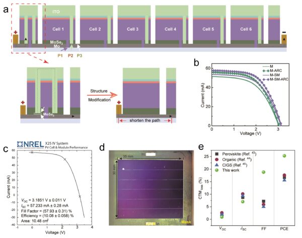 “Based on the improved uniformity of the absorber film, we successfully achieved an average efficiency of 13.4% for single-cells with very low standard deviation and an 8.91% efficiency for the solar module,” Wang stressed. “But this was not the end. We had further modified the module structure to reduce non-ideal contact and shunting caused by series resistance, resulting in a certified 10.1% efficiency and an aperture area of 10.48 cm2 with a low CTMPCE of 25.3% and the lowest CTM loss in open-circuit voltage (0.93%) and short-circuit current (7.03%) among state-of-the-art emerging thin-film solar modules.”