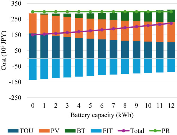 The study also considered both current and future target costs. The base and target costs for the installation of a rooftop PV system was estimated at JPY 255,000 ($1,731)/kW and JPY 150,000/kWh, while for the installation of a battery it was estimated at JPY 134,000/kWh and JPY 70,000/kWh. Maintenance cost was assumed at JPY 35,000 per four years, and the feed-in-tariff (FIT) was JPY 16/kWh for the first 10 years and JPY 7/kWh for the subsequent 10 years.