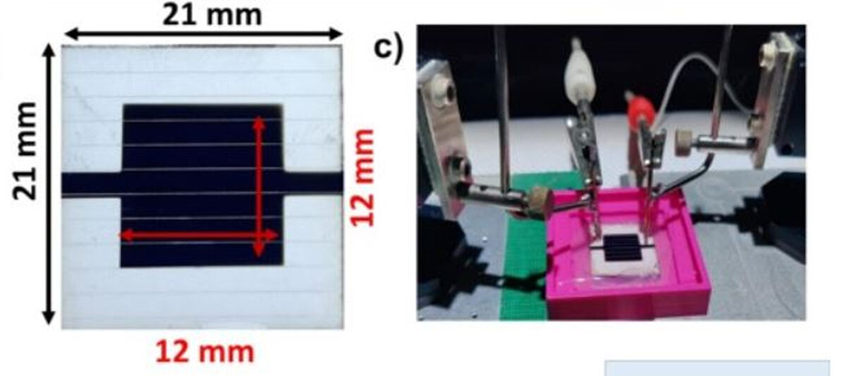 The 12 mm × 12 mm device also relies on a silver (Ag) busbar aimed at improving charge collection and silicon nitride (SiNx) anti-reflection coating. It was encapsulated within a watertight 3D-printed box to ensure impermeability.
