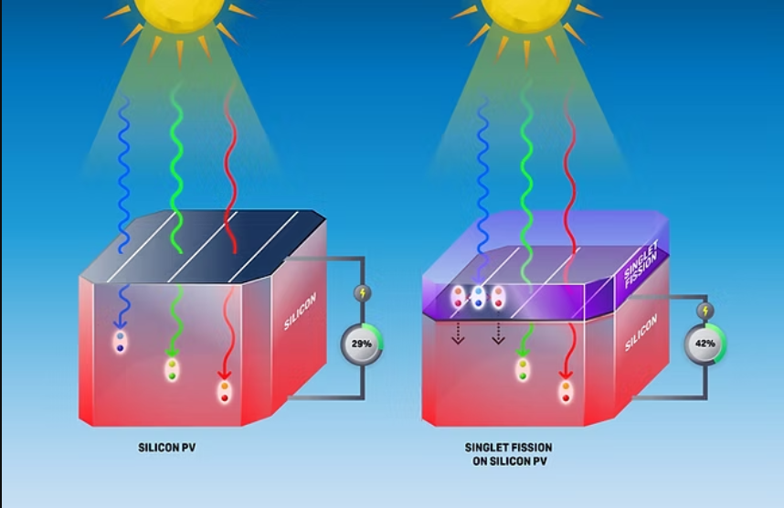 The research says the use of singlet fission molecules on silicon solar cells could increase energy conversion efficiencies from 29% to 42%.