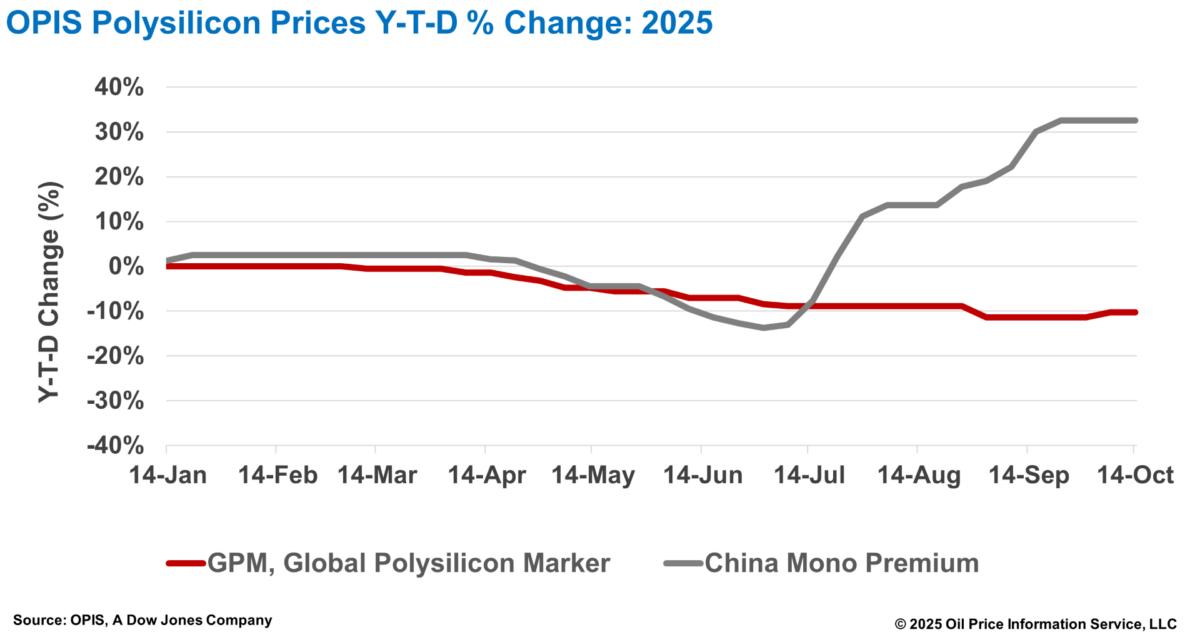 The China Mono Premium—OPIS' assessment for mono-grade polysilicon used in n-type ingot production—unchanged week-on-week to CNY 52.200 ($7.32)/kg, or CNY 0.110/W, according to the OPIS Global Solar Markets Report released on October 14.