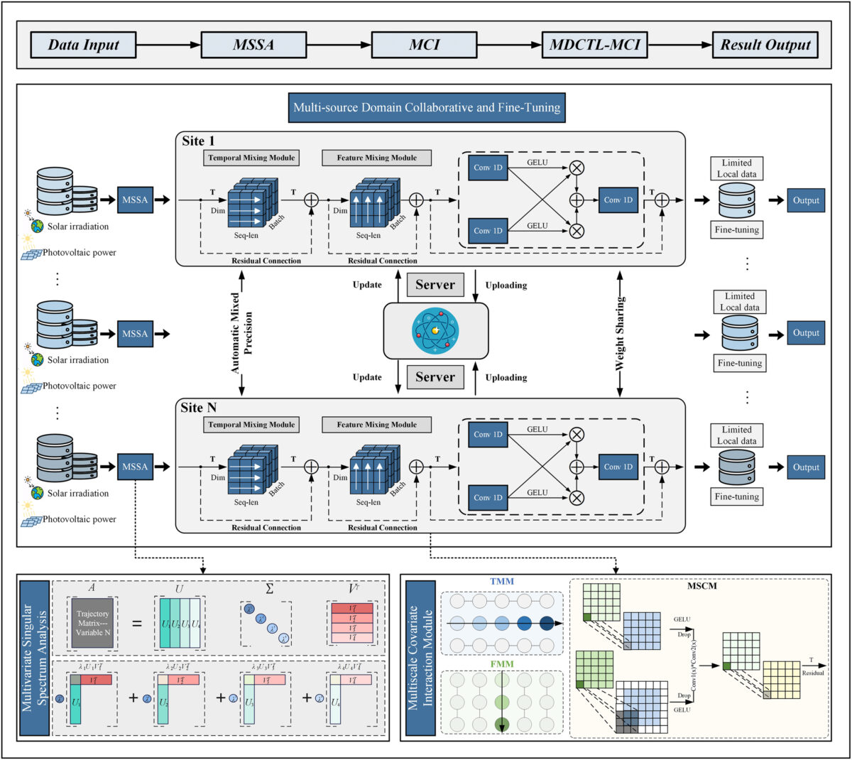 To achieve this, the method first applies multivariate singular spectrum analysis (MSSA) to reduce noise and enhance data representation. Next, a lightweight MCI approach models the relationships among variables and extracts deep temporal patterns. In the third step, the MDCTL strategy enhances model robustness under low-quality data conditions by integrating data from multiple PV sites. Finally, a Shapley additive explanation (SHAP) technique identifies the key factors influencing forecasting performance.
