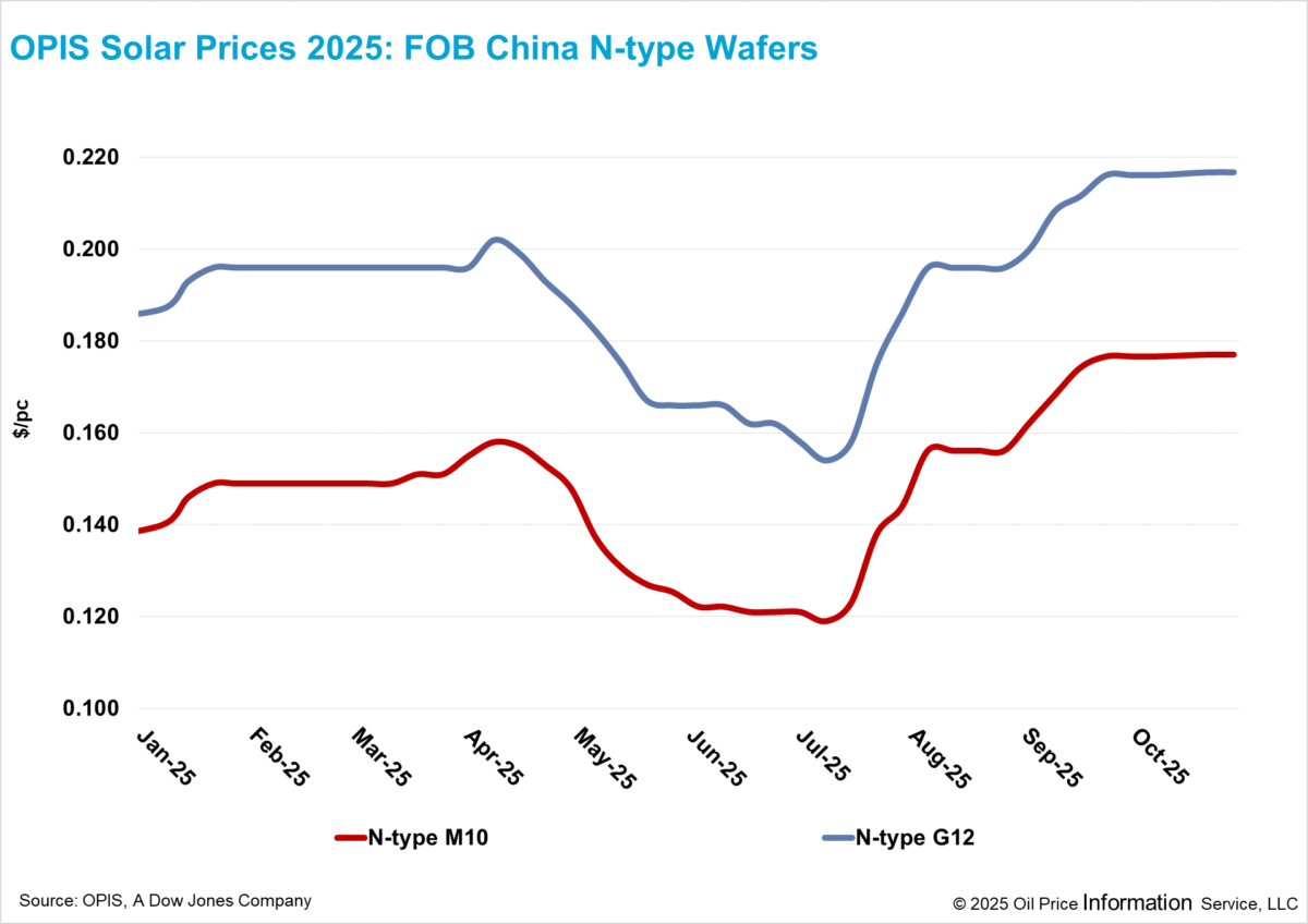 FOB China prices for n-type wafers remained broadly stable this week. According to OPIS Solar Weekly Report released on October 31, FOB China prices for M10 and G12 wafers were unchanged week on week, holding steady at $0.177 per piece (pc) and $0.217/pc, respectively.