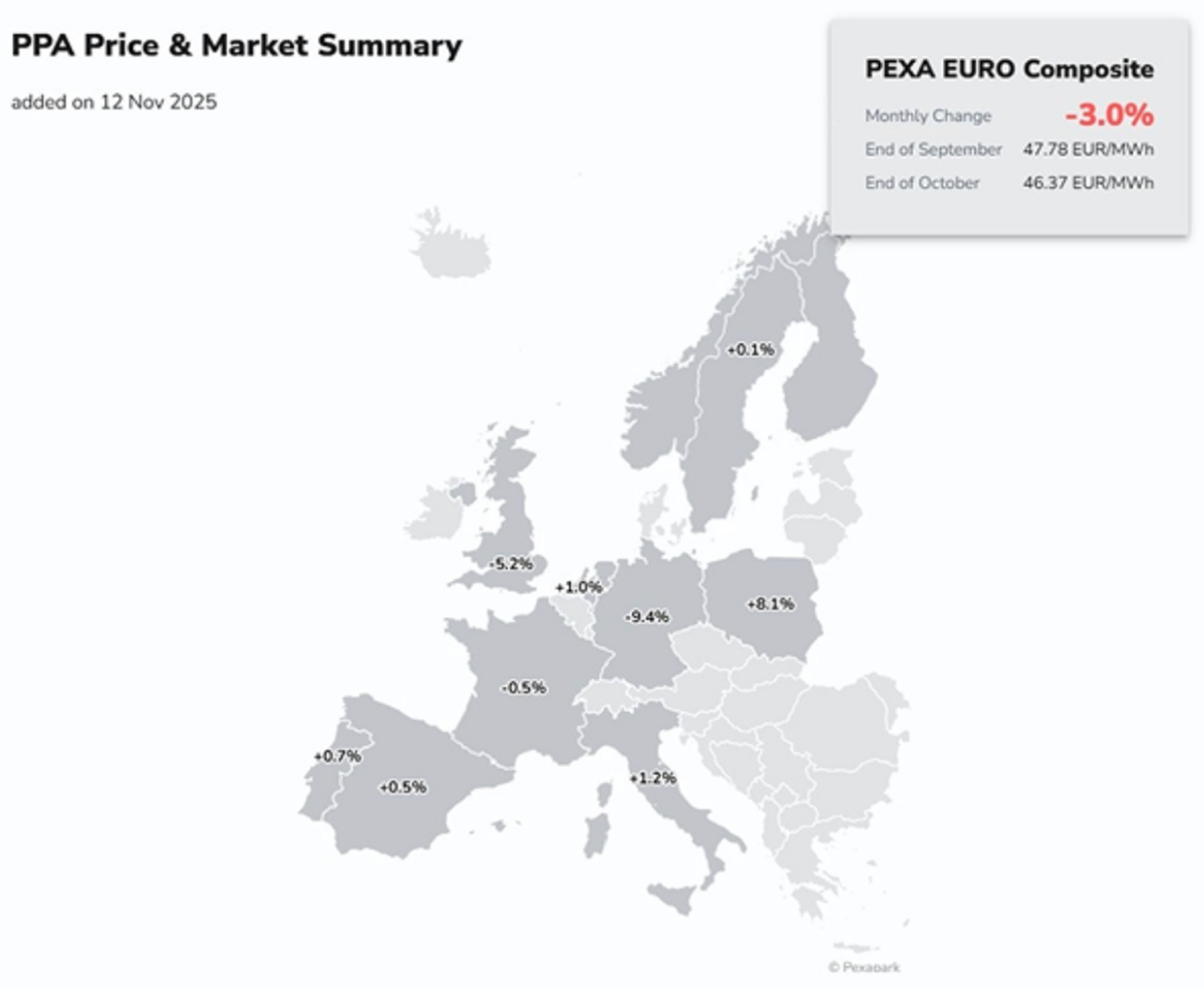 Pexapark’s latest analysis tracked PPA prices were closed at €46.40 ($53.74)/MWh in October, a 3% month-on-month decrease. The analysts say this is the third downward adjustment this year and stems from continued reductions in capture assumptions for solar PV and offshore wind under Pay-as-Produced structures.