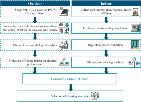 The outdoor tests were conducted at the Atacama Desert Solar Platform (PSDA) run by the Antofagasta Center for Energetic Development (CDEA) at the University of Antofagasta (UA), while the indoor soiling tests were performed at a laboratory of France's National Solar Energy Institute (INES) – a division of the French Alternative Energies and Atomic Energy Commission (CEA).