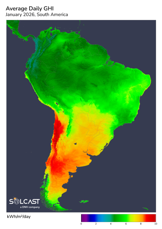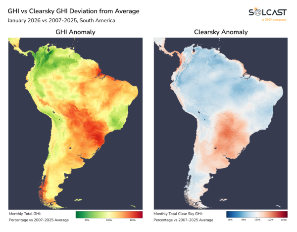 January brought a month of sharp contrasts for South America, with floods in the north, intense heat and wildfires in the south, and scattered severe weather events across Brazil and Ecuador, according to analysis using the Solcast API. Northern regions saw sustained rainfall linked to tropical atmospheric variability, cutting irradiance well below seasonal norms. Meanwhile, southern areas faced extreme heat and prolonged dryness that lifted irradiance levels but also generated large wildfire outbreaks and aerosol-driven reductions. Additional storms, tornadoes and industrial fires contributed to a month defined by highly variable irradiance outcomes across the continent.