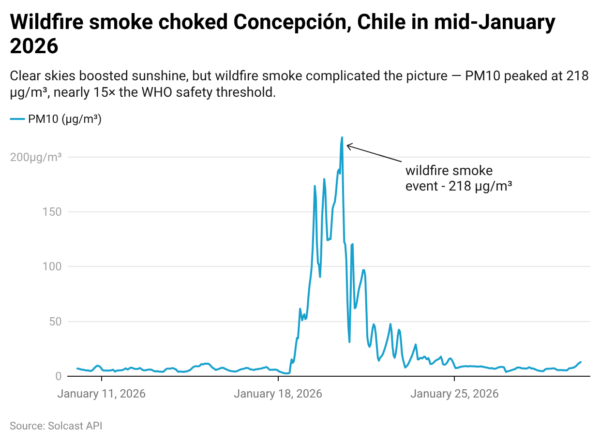 In Chile, hot, dry and windy conditions fueled widespread wildfires that forced evacuations and destroyed infrastructure. Southern Bolivia also experienced a rainfall deficit of up to 12 mm per day, reinforcing the broader dryness. The reduced cloud cover meant some southern areas saw more than a 15% increase in typical sunshine, but wildfire smoke created a complex irradiance picture: aerosol concentrations spiked, as seen in particulate matter data from Concepción, reducing sunlight even on otherwise clear days.