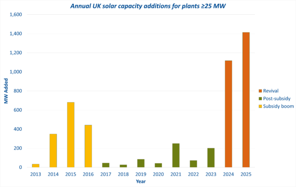 Data from the UK Department for Energy Security and Net Zero (DESNZ) shows deployed solar capacity increased 2.5 GW (12.6%) in 12 months to end of February 2026, a rate of deployment not seen since the subsidy era. Plants in the 25 MW or greater segment in particular have seen a step change in the pace of deployment, with record annual capacity additions recorded in the DESNZ data for 2024 and 2025. These annual growth figures may overstate deployment in those specific years, as DESNZ has been integrating data from a significant volume of previously unrecorded unaccredited plants into its dataset, some of which may have been commissioned earlier. However, the overarching trend is toward a significant increase in the number of large-scale plants coming online each year.