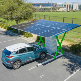 The PairTree off-grid solar charging system for electric vehicles (EVs) combines bifacial solar panels ranging from 4.6 kW to 5 kW, a 42.4 kWh capacity storage system, and one or two AC “Level 2” EV chargers.