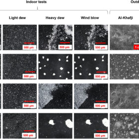 Laboratory and outdoor soiling experiments conducted in Saudi Arabia have shown that increased particle resuspension by wind is one of the dominant factors for high anti-soiling performance in photovoltaic glass.