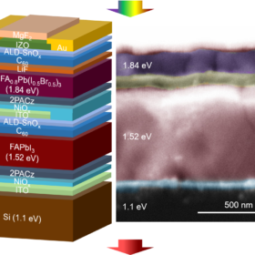 Developed by scientists in Germany, the triple-junction cell is based on a perovskite top cell with an energy bandgap of 1.84 eV, a perovskite middle cell with bandgap of 1.52 eV, and a silicon bottom cell with a bandgap of 1.1 eV. The device achieved an open-circuit voltage of 2.84 V, a short-circuit current of 11.6 mA cm–2, and a fill factor of 74%.