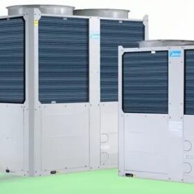 Adveco has released 65 kW and 110 kW heat pumps, capable of scaling up to 1,760 kW by controlling up to 16 systems from a single unit. The pumps feature R32 refrigerant circuits.