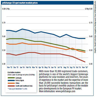 Although the downturn in prices for Japanese and German crystalline modules on the European spot market slowed in November, it could not be stopped. Even prices for modules from China gave way again. Only the prices for imports from southeast Asia stabilized, with a slight upward trend towards December. This development is explained by largely exhausted import quotas and simultaneous sales of the abundant goods stocked from China at reduced rates.