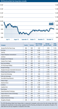 The NYSE Bloomberg Solar Index bounced off lows in December after looking for direction in November. The index finished up 6% thanks to several positive developments throughout the month. Early in the month, the index received support from the COP 21 conference in Paris, which set goals to reduce carbon emissions by 20% in Organization for Economic Co-operation and Development (OECD) countries. Later in the month, U.S.-traded stocks received a boost from the extension of the solar Investment Tax Credit (ITC) in a surprise move for the industry. During the same time, the California Public Utility Commission rejected a net metering rate increase, considered a key hurdle in the adoption of solar. The index performance was offset by trading activity in most Chinese entities, which lagged as rumblings of the domestic FIT cut was more than expected and more chatter about a renewal of EU tariffs on Chinese-produced components.