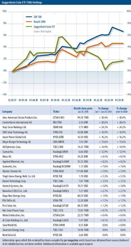 Year-to-date, the Guggenheim Solar ETF (TAN) was down 16.2% versus the S&P 500 and Dow up 8.6% and 6.2% respectively. Within solar, on average, polysilicon stocks (Daqo GCL-Poly, REC, and Wacker) have dropped 49%, module manufacturers (Canadian Solar, First Solar, Hanwha, JinkoSolar, and SunPower) have decreased 15%, and equipment manufacturers (Amtech, centrotherm, Intevac, Manz, Meyer Burger, and PVA) have experienced a decrease of 17%.