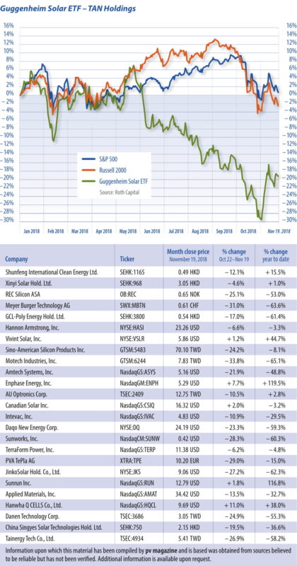 The Guggenheim Solar ETF (TAN) increased 6.5% versus the S&P 500 and Dow that declined 2.8% and 1.7% respectively. Despite the global stock sell-off, solar stocks have had one of their best months in H2 2018 since the China solar policy change.