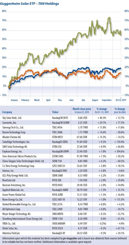 Each month, we examine the drivers of solar stock performance for the heavyweight components across geographies in the index. During the month of October, the vast majority of companies posted positive performances on strong market demand headlines. GCL Polysilicon was up 8% on implications that polysilicon prices will be supported by China’s decision to impose duties on polysilicon imports. Sungrow, the Chinese inverter manufacturer, was up 15% on strong demand in its domestic market and new orders in other Asian markets.