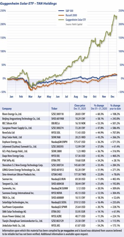 In December, the Guggenheim Solar ETF (TAN) increased 23.2% vs. the S&P 500 and the Dow, which both increased 2.6%. The TAN gained 233.6% vs. the S&P 500 and the Dow, which increased by 16.3% and 7.2% in 2020. The top five solar PV stock performers in the U.S. market for December were ReneSola (SOL), Daqo New Energy (DQ), Enphase Energy (ENPH), Canadian Solar (CSIQ), and SunPower (SPWR). They increased by 45%, 42%, 36%, 22% and 21%, respectively. The top five in 2020 were SOL, ENPH, DQ, Sunrun (RUN), Sunworks (SUNW), with gains of 708%, 572%, 460%, 402%, and 310%.