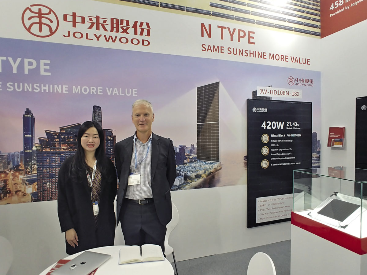 Cathy Huang, European sales director at Jolywood, is pictured with pv magazine publisher Eckhart K. Gouras at the Intersolar Europe exhibition in October