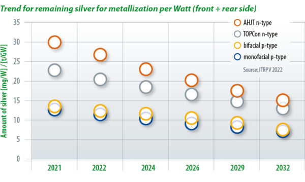 Verlinden explains that PERC uses silver only on the front side of the cell and aluminum on the rear, with some silver on the bonding paths, TOPCon aluminum-silver contacts on the front with pure silver on the back, and with silicon HJT, silver is used on both sides. “And future tandem cells, like perovskite on silicon, also use silver contact on the front and the back.”