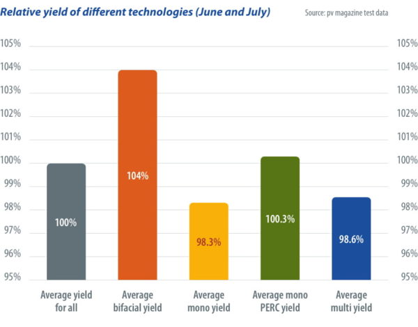 Energy yield is given in Wh/Wp and calculated by dividing energy produced by the module by the PMAX at standard test conditions (STC). This PMAX is the maximum STC power after a process of stabilization, as explained in detail in the June article, and is lower than the nominal power of the modules. This stabilized PMAX is roughly equivalent to the module power after a few weeks of exposure in the field and after the light-induced degradation effect has stopped developing.