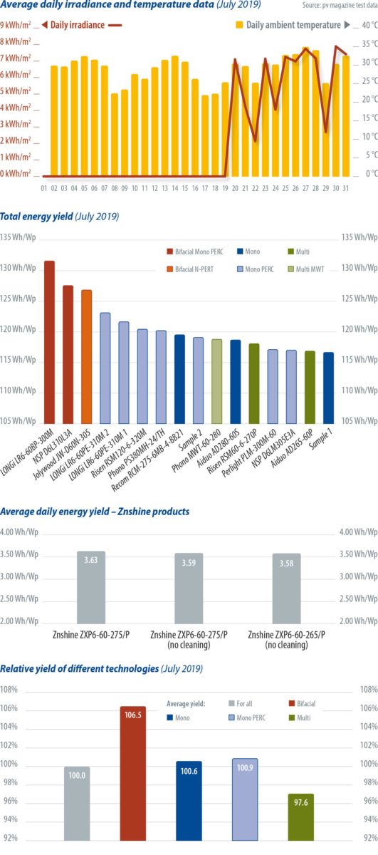 The graph to the bottom right shows the comparison between different module technologies for July 2019. Bifacial modules are performing above the average energy yield level, with multi-crystalline silicon PV performing below the average energy yield level.