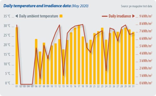 A new bifacial mono PERC product (RSM114-6-405BMDG) from Risen Energy was installed on April 15. It has now been tested for an entire month and its performance will be shown in this month’s results. The average bifacial boost is 7.7% for May 2020. Bifacial boost is defined as the extra energy yield of the bifacial products, compared to the average energy yield of all the mono-facial mono PERC products. The chart to the bottom right shows the comparison between different PV module technologies for May 2020. Bifacial modules continue to perform steadily above all of the other technologies, with multi crystalline silicon PV having the lowest yield.