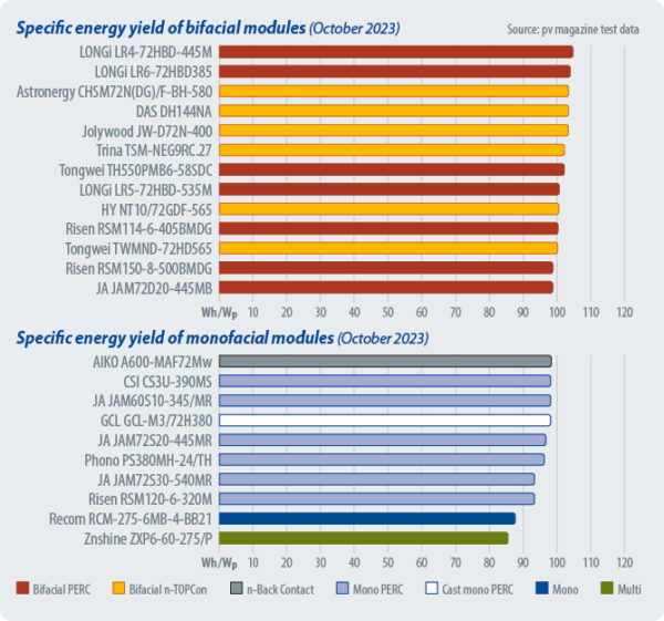 The first chart, pictured above, shows the meteo station data with irradiance and ambient temperature for October 2023. Due to an issue with the collection of information, system data is missing for Oct. 14 to Oct. 16. We observed that the energy yield figures of several top-performing products are very close and this could render the numbered ranking method we have been using less meaningful. CEA is currently working on a new ranking system that will adapt to these new trends and be more representative of product performance.
