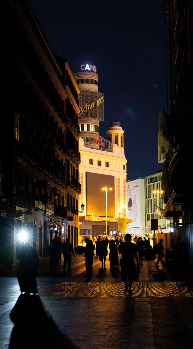 People walk along Preciados Street in Madrid toward Callao Square during the April 2025 blackout.