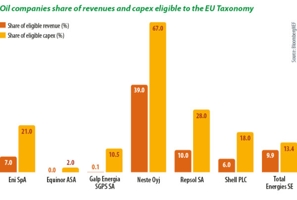 Reporting under the EU taxonomy has begun and the results aren’t pretty. As of Sept. 16, only 25.6% of companies’ revenue, on average, 32% of capital expenditure (capex), and 25.3% of operating expenditure (opex) were eligible for the taxonomy – generated by or invested in activities considered green by the EU, or which have the potential to be green. Some 834 companies made taxonomy-related disclosures in their 2021 financial results. Of those businesses, 793 disclosed the percentage of revenue eligible for the taxonomy, 777 their green capex, and 747 their eco-friendly opex, according to Bloomberg.