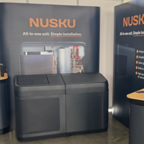 Nusku has developed a prototype of a fully integrated air-source heat pump system that combines the heat pump with a hot water cylinder and controls into a single outdoor unit. The design aims to simplify installation and reduce space requirements by replacing separate indoor and outdoor components with one pre-packaged system.