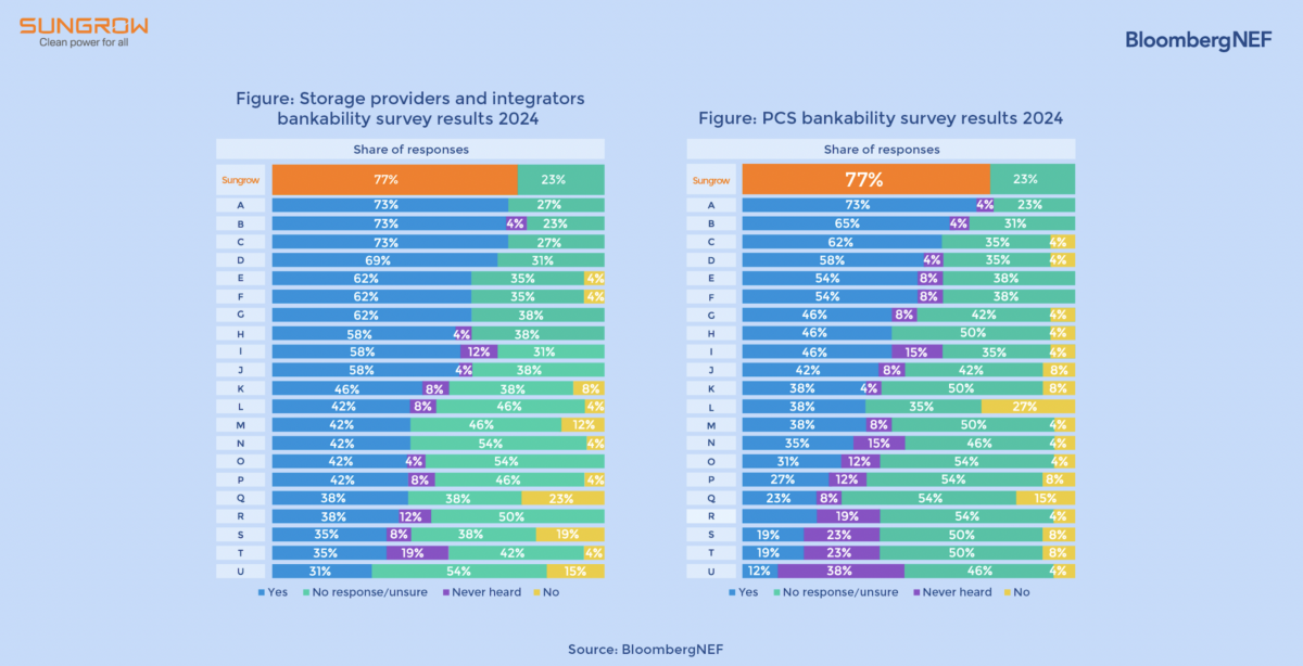 BloombergNEF is recognized by numerous international financial institutions as among the most credible third-party renewable energy research hubs. Sungrow’s No.1 bankability ranking represents that projects using the Sungrow energy storage system or PCS are more likely to obtain financing from banks than other competitors, ensuring favorable and sustainable benefits for stakeholders. This year, over 80% of the bankability survey participants are headquartered in the US or Europe, this highlights that Sungrow’s ranking demonstrates robust trust from stakeholders in the global financial market and energy storage field.
