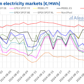AleaSoft Energy Forecasting says higher wind production, lower electricity demand, and a drop in average temperatures led to falling electricity prices across most major European markets during the fourth week of August.
